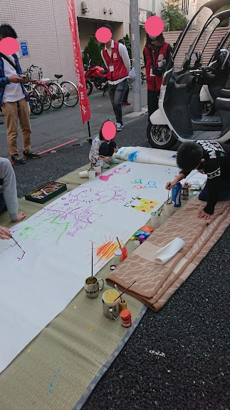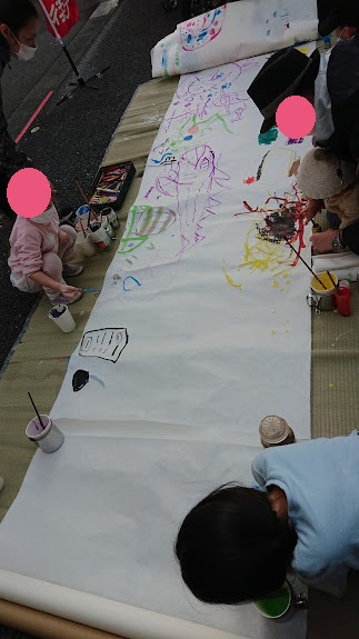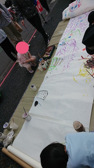 みんなで大きな絵を描くイベント (地元のアートイベント 1dayパフォーマンスに参加・子供無料・お菓子が貰えることもw) 北千住のアートイベントで、【大きな絵をみんなで描く】 というワークショップを致しました。 長さ10メートル・幅90センチの大きな紙を広げ、 水彩絵の具・ポスターカラーなどで 通りがかりの人が、皆で絵を描きます。 参加者のほとんどが子供ですが、 親御さんも、決定的瞬間をシャメしたり、 (家が狭くて)普段はできない、大きな、グチャグチャな絵を 「今日は、好きなように書いても良し」などと 子供に声援を送ったりもしていました。