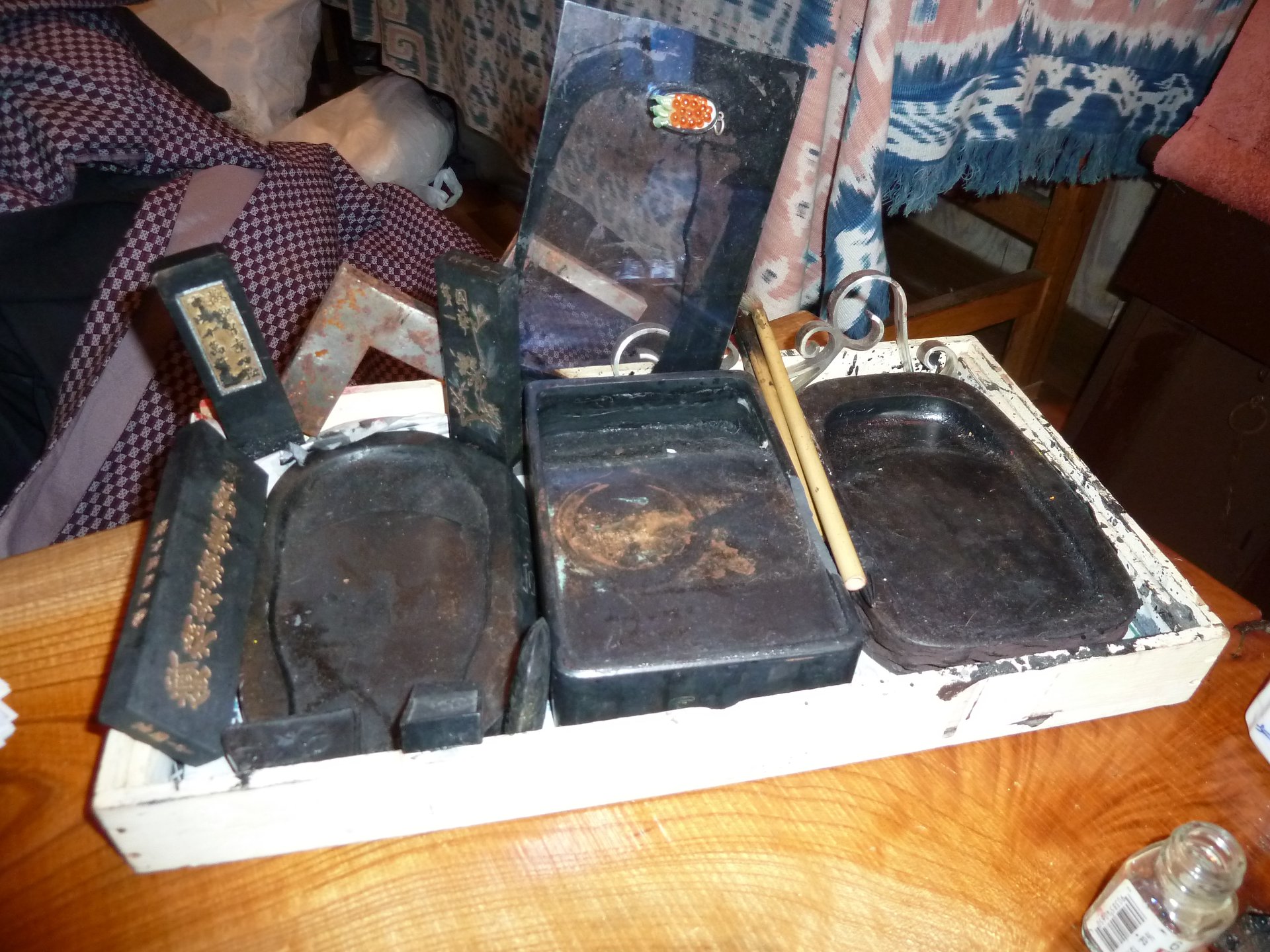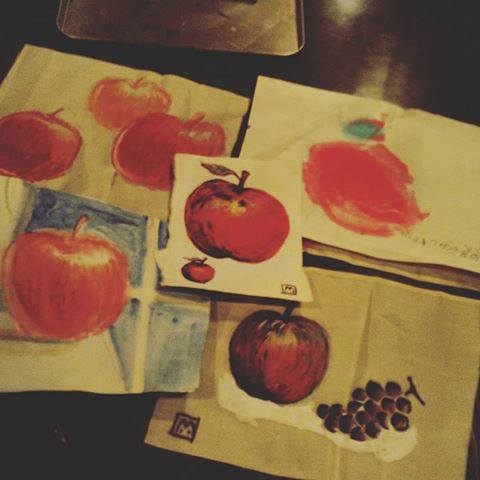最近は、三つ使っています。 メイン用、余分な墨を落とす用(もしくはグレー墨用) 水用です。 真ん中の奥にあるのは、自作の硯蓋で、 イクラのキーホルダーが取っ手になっています。 書道家の人が訪ねてきたときには、 洗ってくださいます。(ガチで、、、、汗) ----------- このほか、日本画の講習会は、イラストレーターの知人向けに、過去二回(無料)実施されました。 [→この後懇親会となります。】 作品の幅を広げるためとか、画材の特徴などを学ぶためです。 参加は無料ですが、画題は、【リンゴ】と決まっており、 習作は、おじゃらのコレクションに自動的に追加されます。
