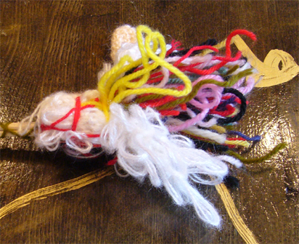 足立区書道協会の展覧会に出品するため 路地で、作品を作っていた時に、 太い筆が高すぎて買えないという問題がありました。 何か良い案は無いかなと思っていたところ、 テレビで、筆づくりの番組を拝見し、 自作してみることにしました。 創作というのは、思いのほか自由なものなのです。 (高齢で目が見えなくなったため) 知人が下さった、編み掛けの「ぬいぐるみ」の毛糸を 利用して、いくつか筆を作ったり、 書を作ったりしていた頃のことです。 ----------- この筆づくりを見た人が、自分も作りたいと申し出たため、 【毛糸筆ワークショップが始まりました】 ワークショップは、ゲリラ的にスタートすることが多いです。 材料も、割りばしと、廃材のため、無料です。 【見本作品】