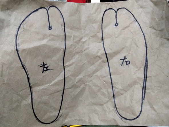 ダンボールなどに、自分の足を置き、 足の形を、鉛筆などでなぞって、 足袋底のある程度のサイズを確認しましょう。