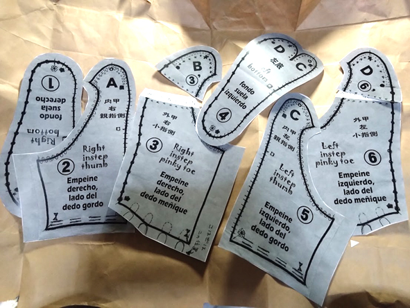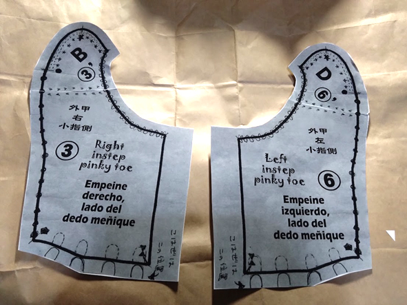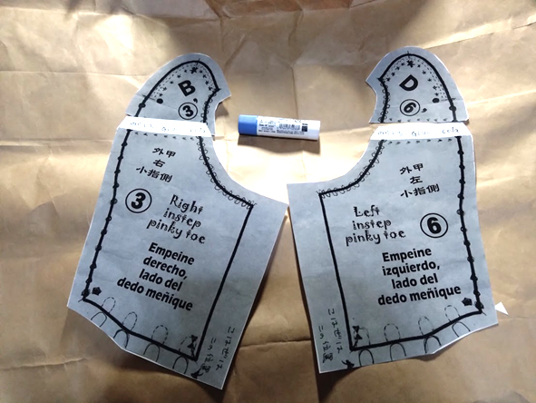 この型紙は、全て布地の裏面の上に置いて 作業をしますので、忘れないように、 メモを書き入れます。 それから、番号と、【左底】【内甲左】のように、 型紙の名称を書き入れましょう。