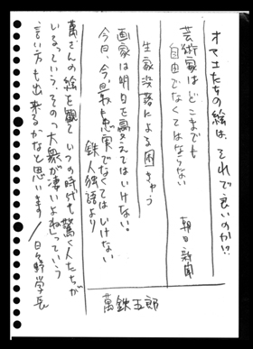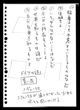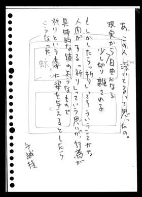 思いついたときに、何か書き留めたり、 自由律俳句も作ります。 手書きの原稿を残したいと考えて、 なるべく、半紙などに、墨で書くようにしています。 いくつか、電子本にしているので、 そちらをご紹介します。 本当にひどい嫌がらせを受け続け、 全く関係のない方にもご迷惑が かかっていることが理解できましたので、HPは、 全て削除させていただいたので、 25年間の 私の芸術活動をお知らせできないのが残念です。 私を疑うのであれば、 まず、ネットの暴力を正してください。 --------- 詩とか、ドローイングとかの PDF 電子本を見る (上から4個は、画像を押すと、PDFが開きます。) 電子本は、50冊ぐらいあったと思いますが、 ネットの嫌がらせのため、 削除致しました。 --------- こちらから下は、書とかの作品です。